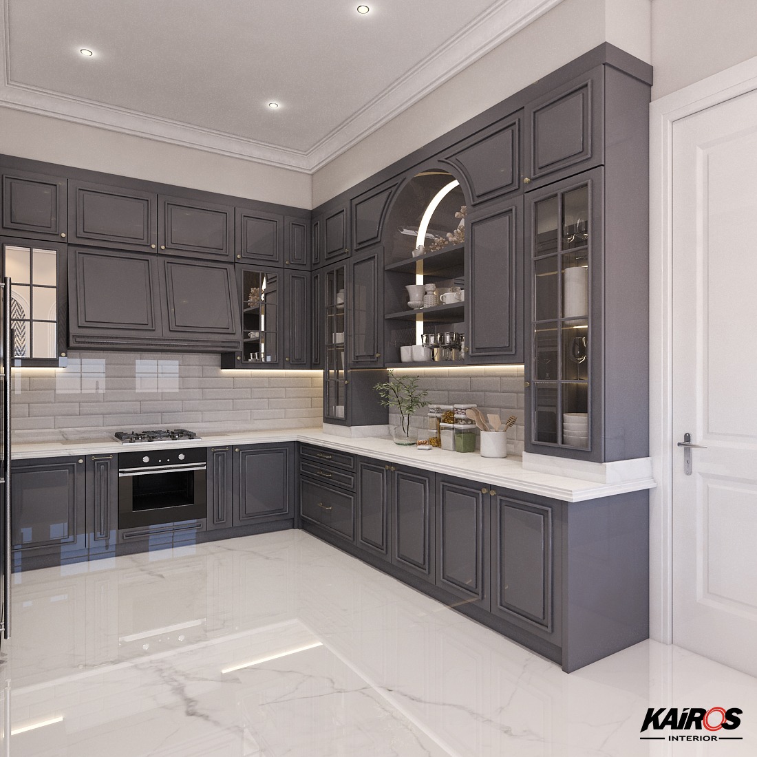 Warna putih cocok untuk area pantry memberikan tampilan timeless. Bisa dikombinasikan dengan aksen gold agar tampilan lebih mewah.