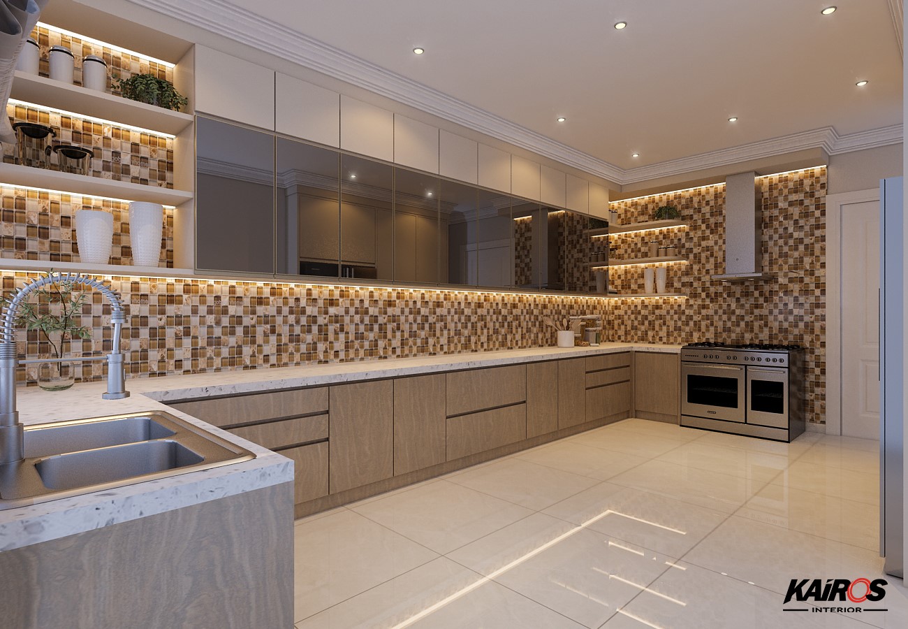 Pantry set letter L berbentuk seperti huruf "L" yang dapat memaksimalkan area sudut pantry Anda.